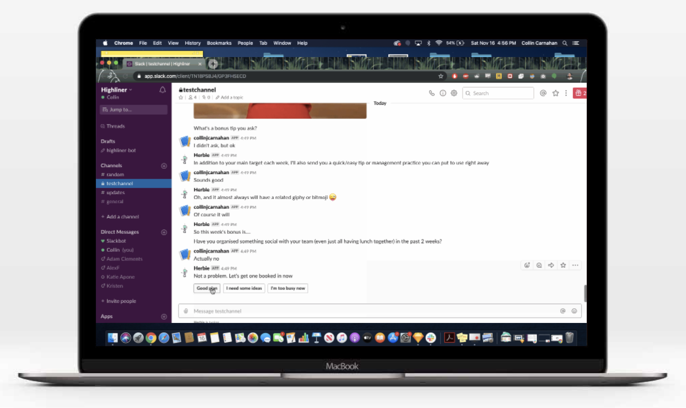 I started by leading product ideation sessions. At this point, the CEO didn’t have a set vision on what product the team would be building. I led the team through design sessions to focus on the leanest product that would test our assumptions. During our sessions, we ideated what we should build: an app, an online learning course, a chatbot experience, or countless other options. I facilitated the group to consensus on a decision based on our research and data collected. We chose a Slack-integrated chatbot that delivered personalized and actionable reminders to mid-level managers. This was a scalable way that we could test our assumptions and it met people where they were already—in the Slack app.